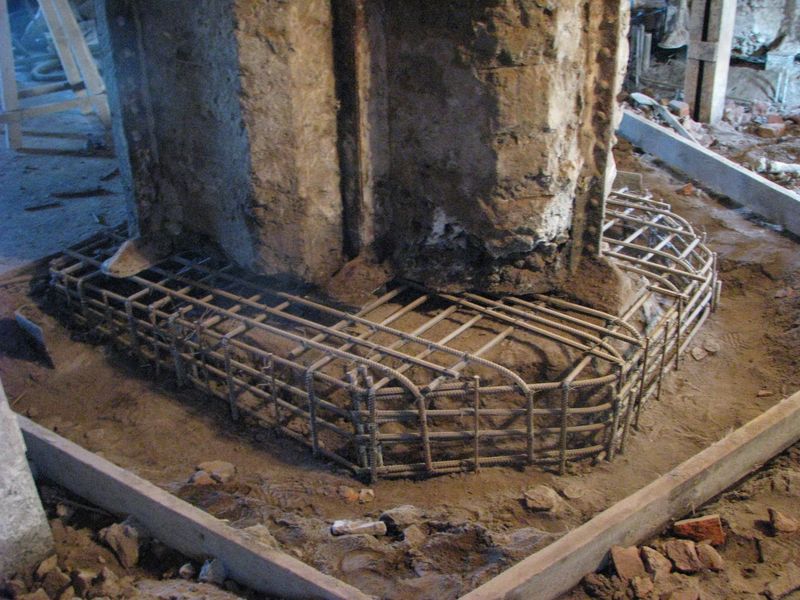 - подводкой под существующие фундаменты новых железобетонных элементов.